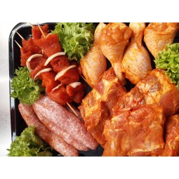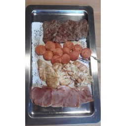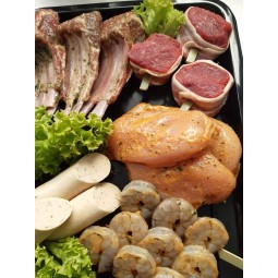 Saté, kippenbout, barbecueworst Aanvullend: Koude groentenkrans, aardappelen naar keuze (gebakken krielaardappelen of aardappelsalade of aardappelen in de vinaigrette of rustieke aardappelsalade), pastasalade of rijstschotel en 3 sausjes. Warme groentenkrans, gebakken krielpatatjes en 2 warme...